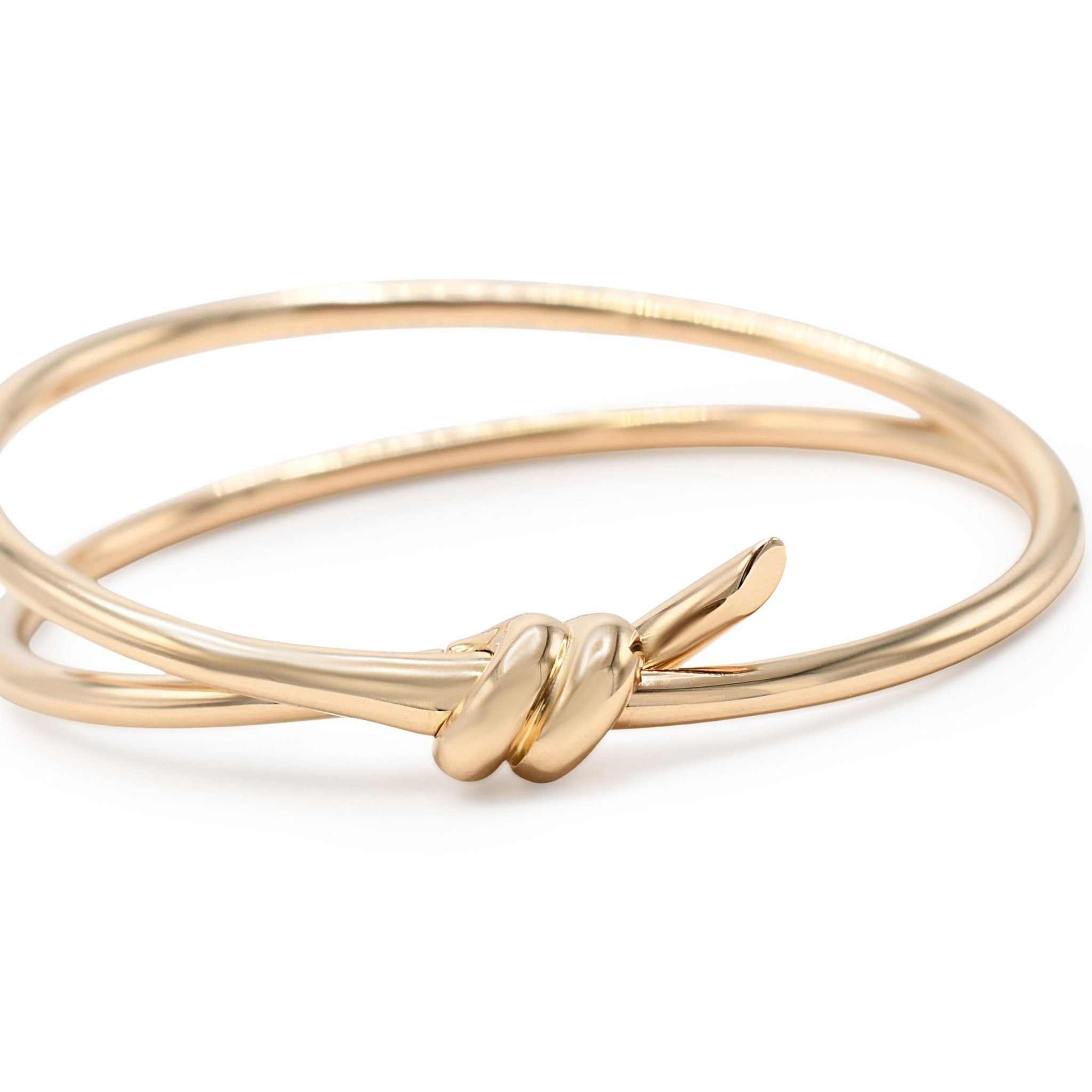 This pre-owned bracelet exudes the timeless charm that Tiffany & Co is known for. The double row of Rose Gold entwines in a graceful knot, symbolizing the strong bond of love and commitment. With its hinged design, this used bangle is not only a statement piece, but also comfortable and practical to wear.