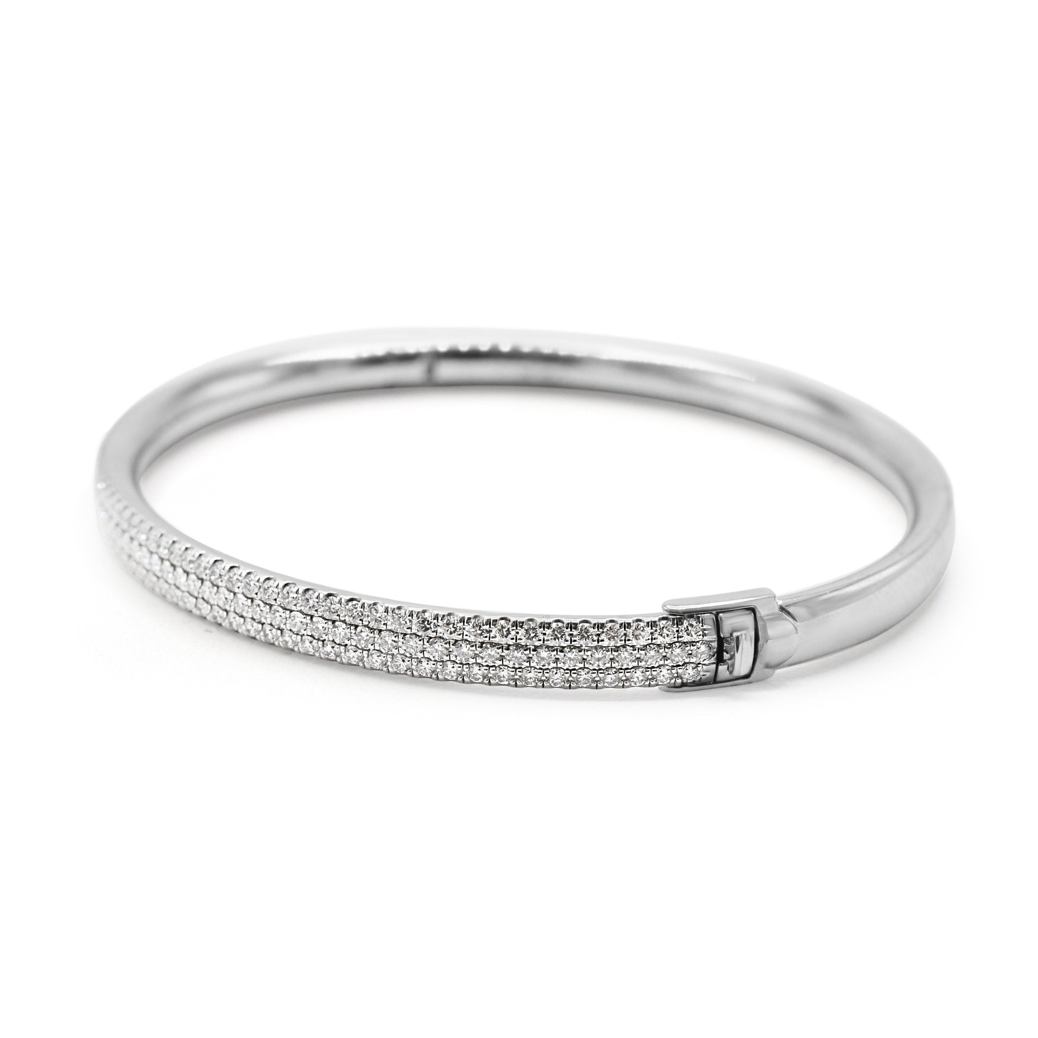 Indulge in the ultimate luxury and sophistication with this Pre-Loved Tiffany Metro Three Row Hinged Diamond Bangle. It is a timeless piece that will elevate any outfit, making you feel like a true queen. So why wait? Add this stunning bracelet to your collection and let the diamonds do all the talking.