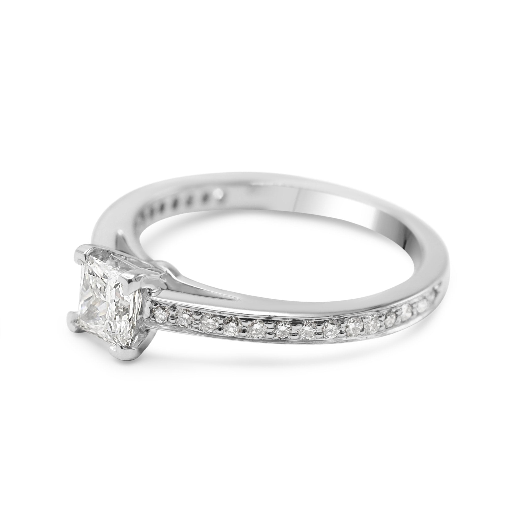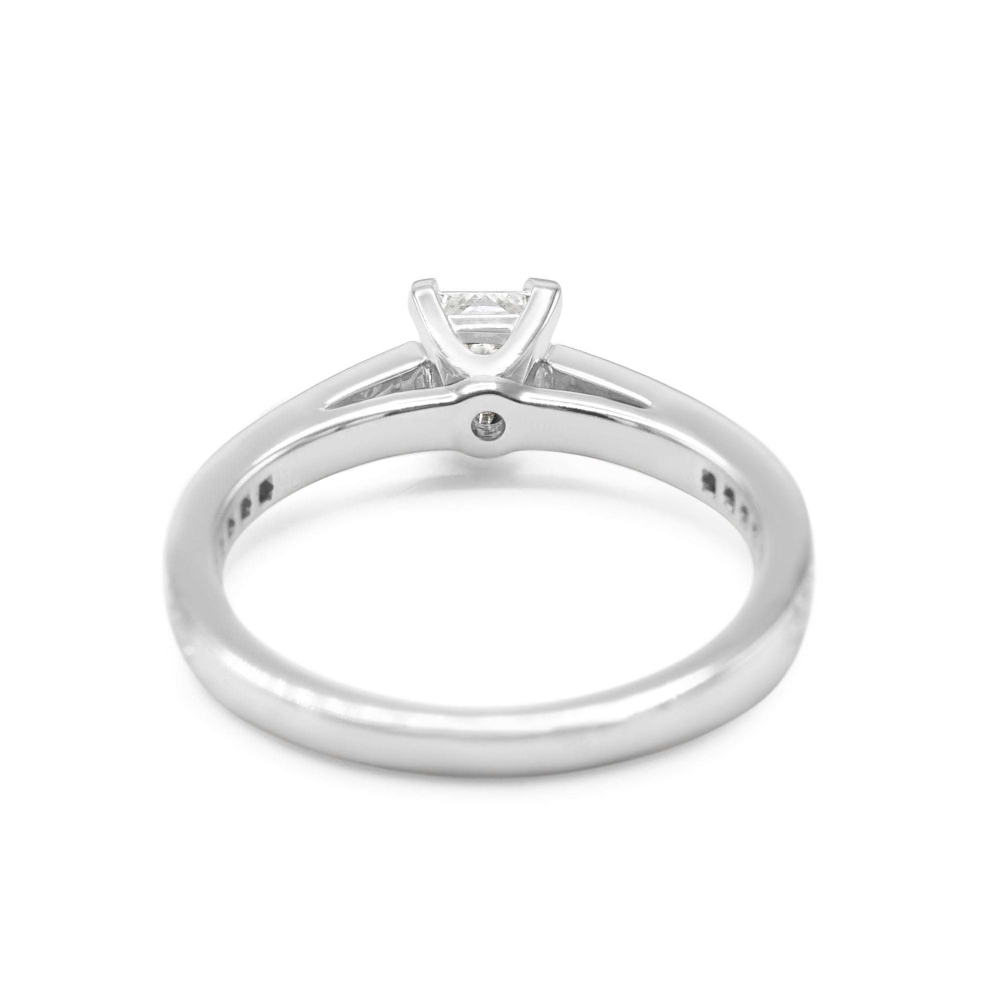Crafted to perfection, this pre-owned ring features a dazzling 0.36 carat Princess Cut Diamond at its centre, surrounded by a total of 0.14 carats of sparkling Diamonds along the shoulders. The brilliant E colour and VVS1 clarity of the Diamonds will leave you mesmerized, while the impeccable cut of the stones ensures a stunning display of light and fire.
