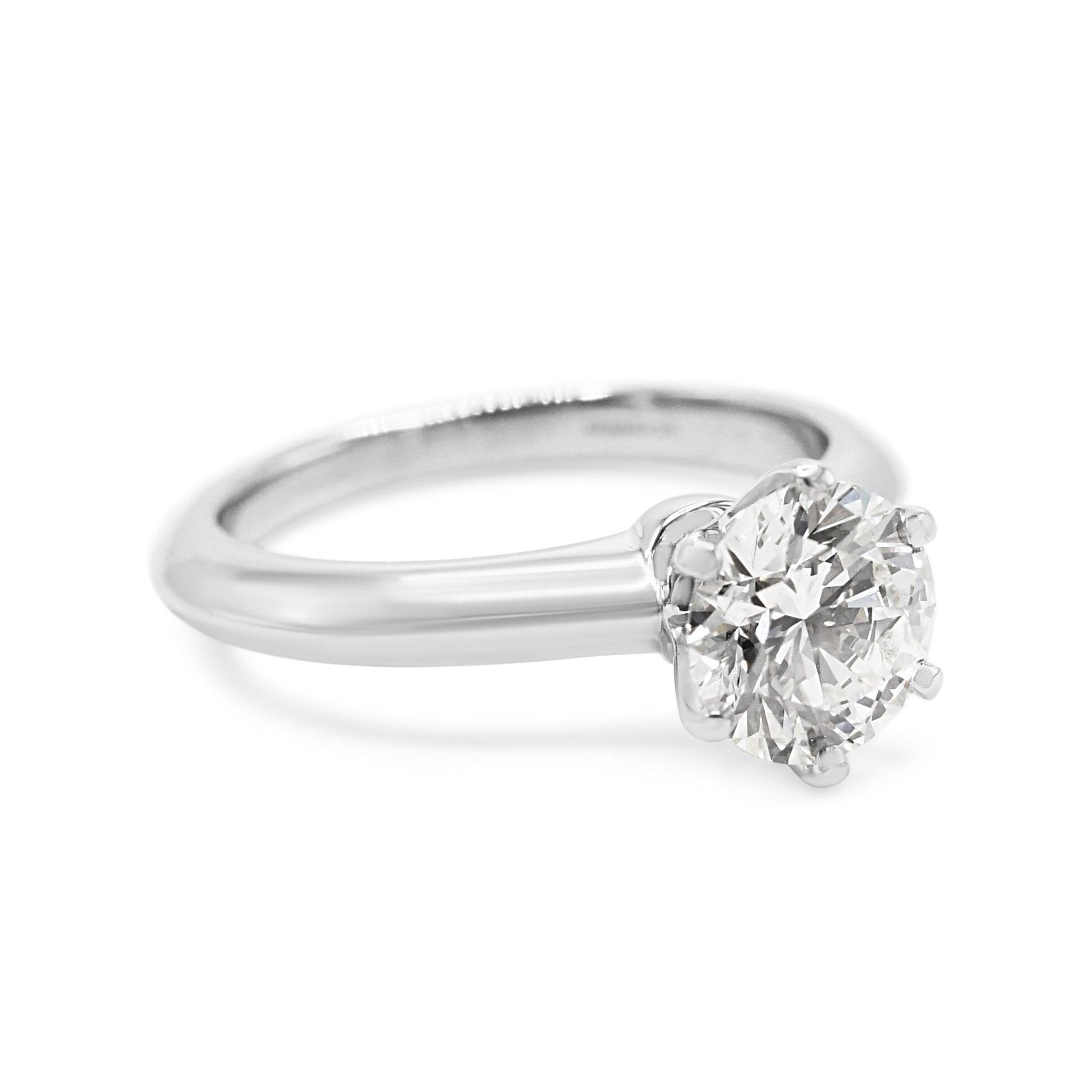 Introducing the epitome of timeless elegance and luxury - this second hand Tiffany Solitaire Brilliant Cut Diamond Ring. This stunning piece, crafted with the finest Platinum and adorned with a dazzling 1.20ct Diamond, is a true symbol of love and devotion.