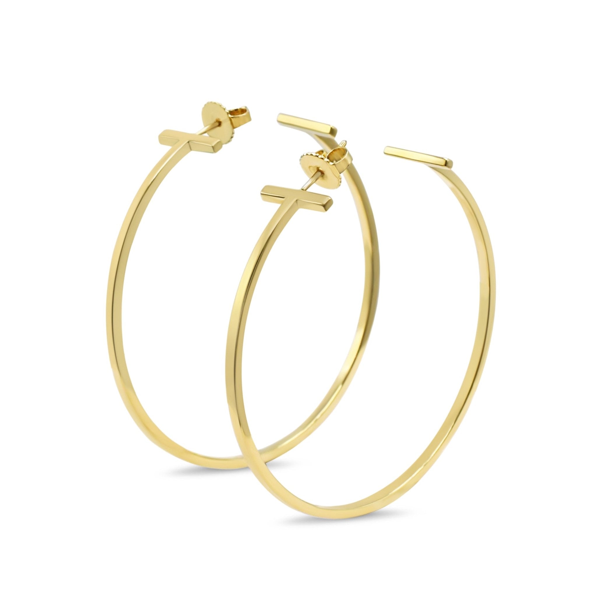 Introducing the ultimate statement piece for all fashion-forward women - these second hand Tiffany T Wire Hoop Earrings XL in 18ct Yellow Gold. From the renowned brand Tiffany & Co's iconic T collection, these earrings are a true testament to the brand's timeless elegance and exquisite craftsmanship.