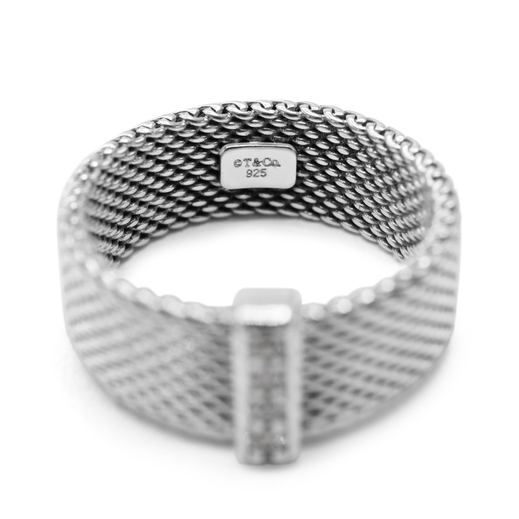 Elevate your style and add a touch of luxury to your look with this second hand Tiffany & Co Somerset Diamond Mesh Ring. This stunning piece features a unique and intricate design, crafted with the highest quality Sterling Silver. The intricate mesh pattern is adorned with dazzling Diamonds, giving the ring a sparkly and sophisticated touch.