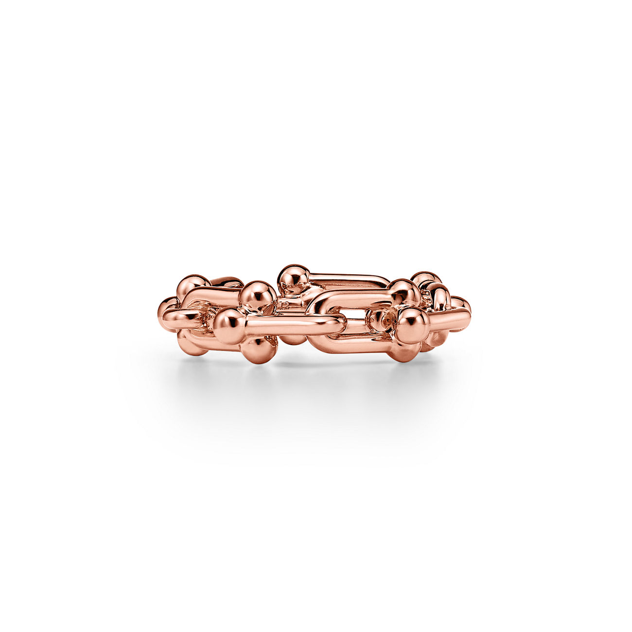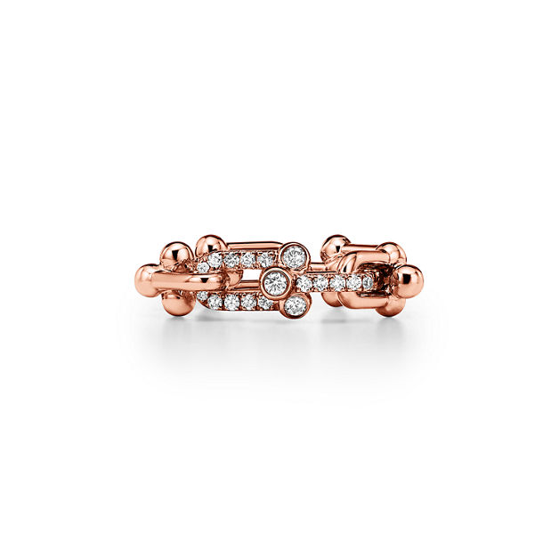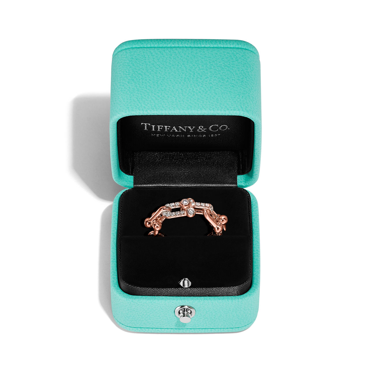 Tiffany hardwear is an expression of love’s transformative strength. Inspired by a quintessential bracelet from 1962 found in the house’s archives, hardwear embodies enduring resilience and uninhibited spirit. This 18k rose gold ring features the collection’s signature gauge link design with a striking contrast of metal and diamonds. Tiffany artisans carefully hand set each diamond to achieve maximum shine. It makes a beautiful statement worn on its own or mixed with other metals.